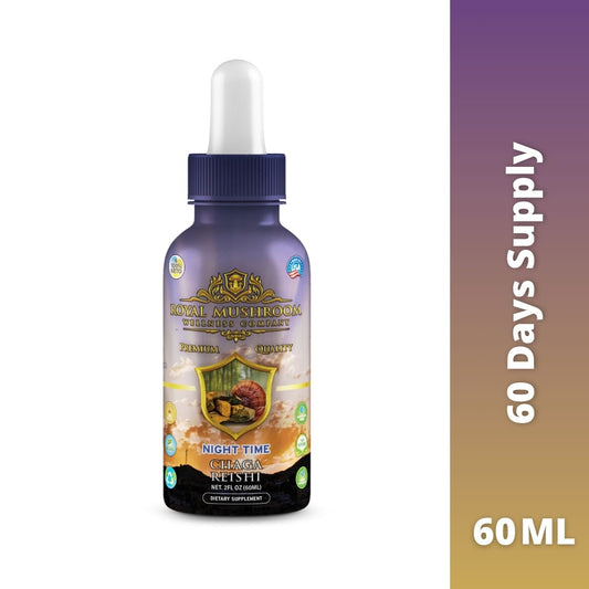 Night Time Tincture Chaga + Reishi Experience the perfect balance of earth and mushroom, with the calming and restorative benefits of Chaga and Reishi, perfect for a peaceful night's sleep. A gentle infusion of natural goodness to help you drift off to dreamland, so you can wake up feeling refreshed and energized.